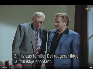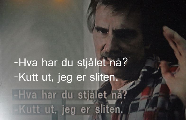 A more recent typical use of subtitles as seen in this captured screenshot from a YouTube video (Derrick, random episode), but with authentic subtitle style from the Norwegian TV-Channel NRK.