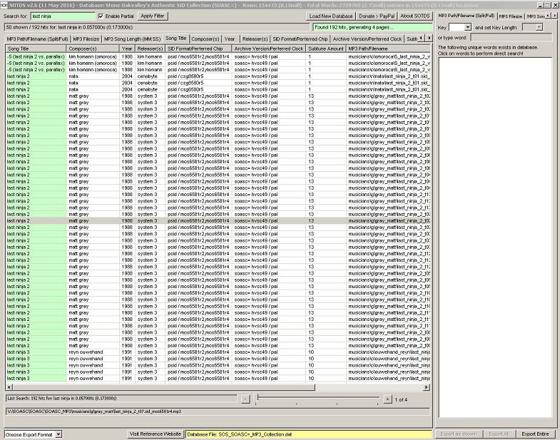 Note that the RawText is based on single words only (it has been pre-split by space only), so you can't type ''last ninja'', but rather type 'ninja' and search for that. It was split (by just space character) into a sentence of max 4 words each. It should be noted that it is single word logic initally, but will in any case bring in 3 other words that belongs to the same sentence as found in the original text extraction. These can be interpreted as ''sentence begins with (1st word)'', ''sentence ends With (4th word)'', or those inbetween as ''sentence contains (2nd, 3rd word)''. The word-sequence given back during search hits appears in the original music file as indicated, so if you want to read the rest, you have to either download the file or check it yourselves from your collection. At least this database will give you and quick and fast pinpoint to find what you are looking for :-)