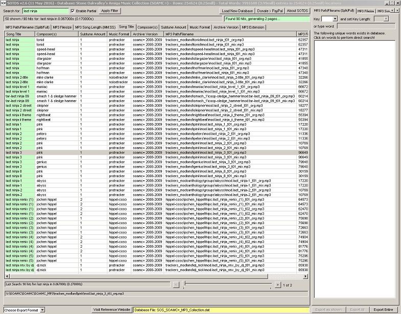Note that the RawText is based on single words only (it has been pre-split by space only), so you can't type ''last ninja'', but rather type 'ninja' and search for that. It was split (by just space character) into a sentence of max 4 words each. It should be noted that it is single word logic initally, but will in any case bring in 3 other words that belongs to the same sentence as found in the original text extraction. These can be interpreted as ''sentence begins with (1st word)'', ''sentence ends With (4th word)'', or those inbetween as ''sentence contains (2nd, 3rd word)''. The word-sequence given back during search hits appears in the original music file as indicated, so if you want to read the rest, you have to either download the file or check it yourselves from your collection. At least this database will give you and quick and fast pinpoint to find what you are looking for :-)
