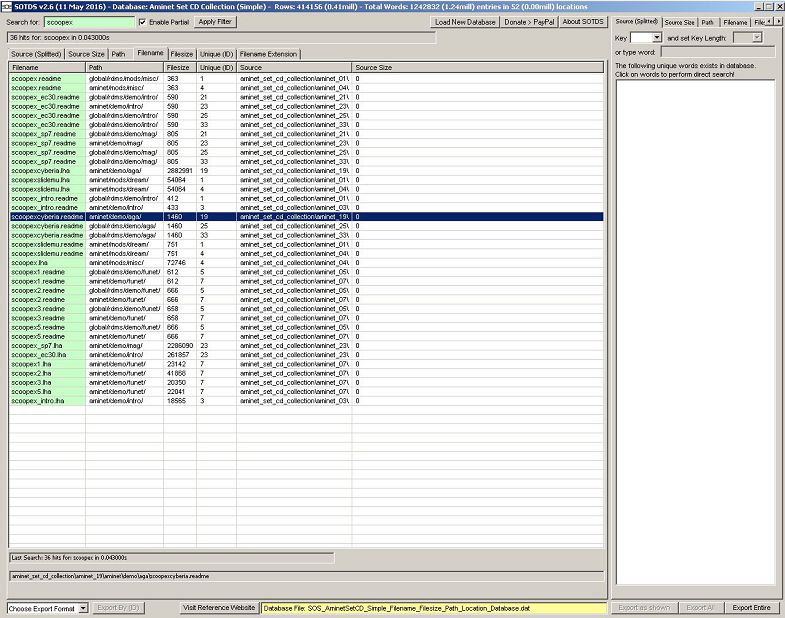 In addition this database features SOTDS Unique ID mode which quickly lists ALL files that were indexed on any of the Aminet Set CD's as a regular type of directory listing (at least path/filename and filesize. No date or attribute flags where indexed).