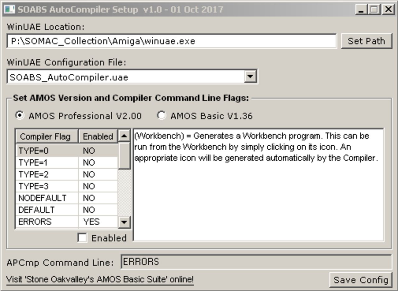 SOABS_AutoCompiler_Tool.exe = Creates appropriate batch files to auto-run in customized WinUAE environment, fully supporting AMOS Basic v1.36 code production and excutables as well as AMOS Professional V2.00 code and executables!