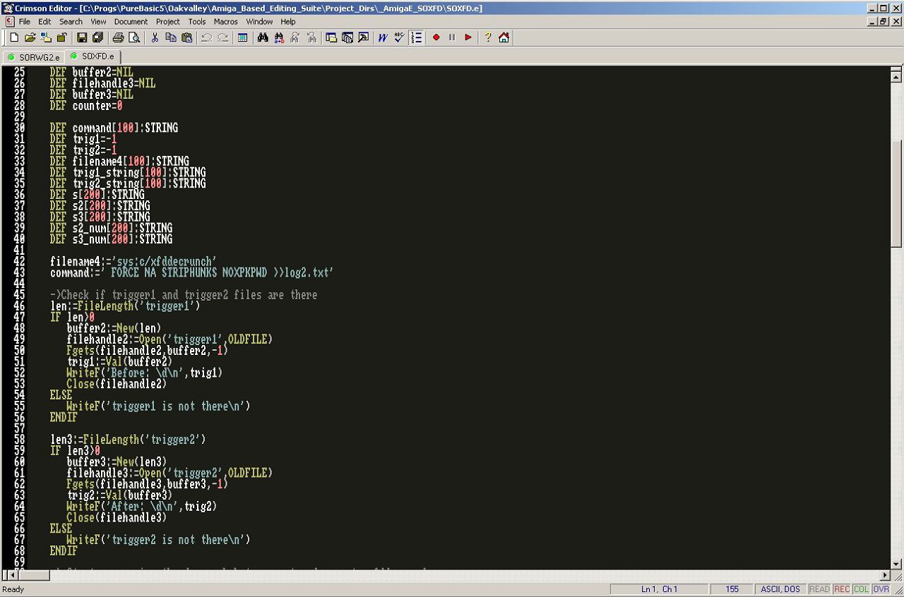 As seen in my January 2018 update I was really thrilled with SciTe editing software until after several months of using it and configuring editing environments for PureBasic Amiga, MasterSeka (assembler), ASMOne (assembler) I just couldn't get satisfied with SciTe editor after all. The problem is the little ackward definition of syntax and adding own programming languages into it. It just doesn't work properly. I ended up using "verilog" specfications and tweaking it with colors and syntax definitions, but ended up having to separate a copy of the editor into its own directory with its own SOABS specifications into it. For some weird reason adding languages to it, the SciTe must be recompiled to support it. Something else had to be found.Then I discovered "Crimson Editor" and let me tell you that is a completely kick-ass editor. It has a nice Windows XP look, no cleartype shit, incredible easy to add filename extension filter as well as adding lanuage specific files with very convenient preferences. Its easy to add new language and syntaxes, and I ended up adding AmigaE, AMOS, Assembler and PureBasic in matter of minutes!