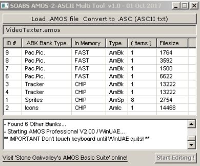 SOABS_AMOS-2-ASCII_Multi_Tool.exe = Will read .AMOS files, extract banks, create a ASCII version and re-injects LOAD banks statements so from now on you edit and work with regular ASCII txt files, every bank you ever included are now extracted and loaded during compilation.