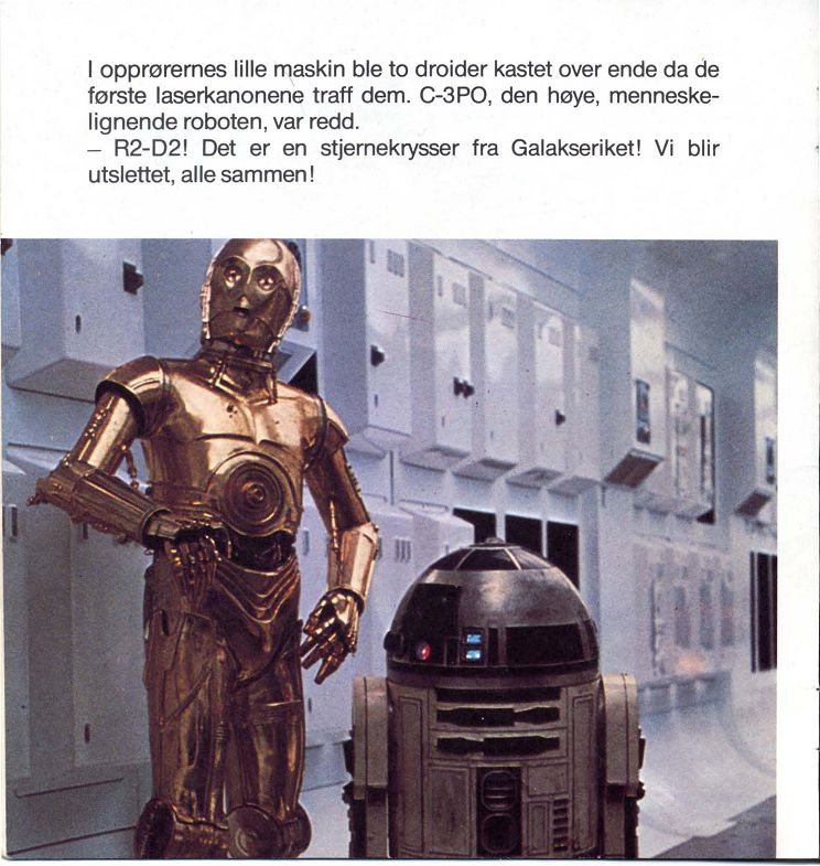 I opprørernes lille rl'\askin ble to droider kastet over ende da de første laserkanonene traff dem. C-3PO, den høye, menneskelignende roboten, var redd. - R2-D2! Det er en stjernekrysser fra Galakseriket! Vi blir utslettet, alle sammen!