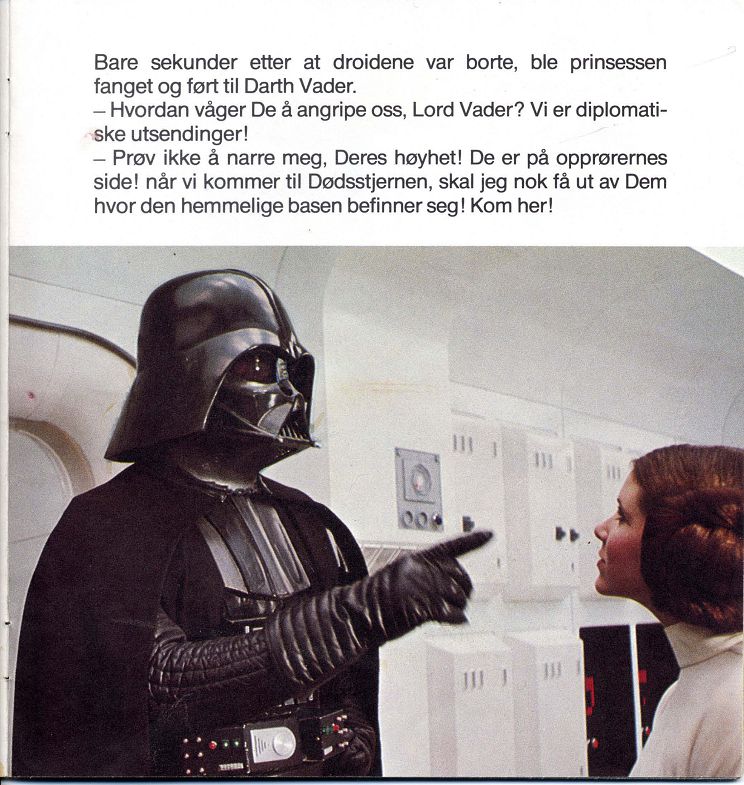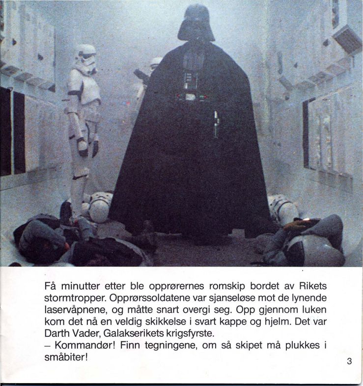 Få minutter etter ble opprørernes romskip bordet av Rikets stormtropper. Opprørssoldatene var sjanseløse mot de lynende laservåpnene, og måtte snart overgi seg. Opp gjennom luken kom det nå en veldig skikkelse i svart kappe og hjelm. Det var Darth Vader, Galakserikets krigsfyrste. - Kommandør! Finn tegningene, om så skipet må plukkes i småbiter!