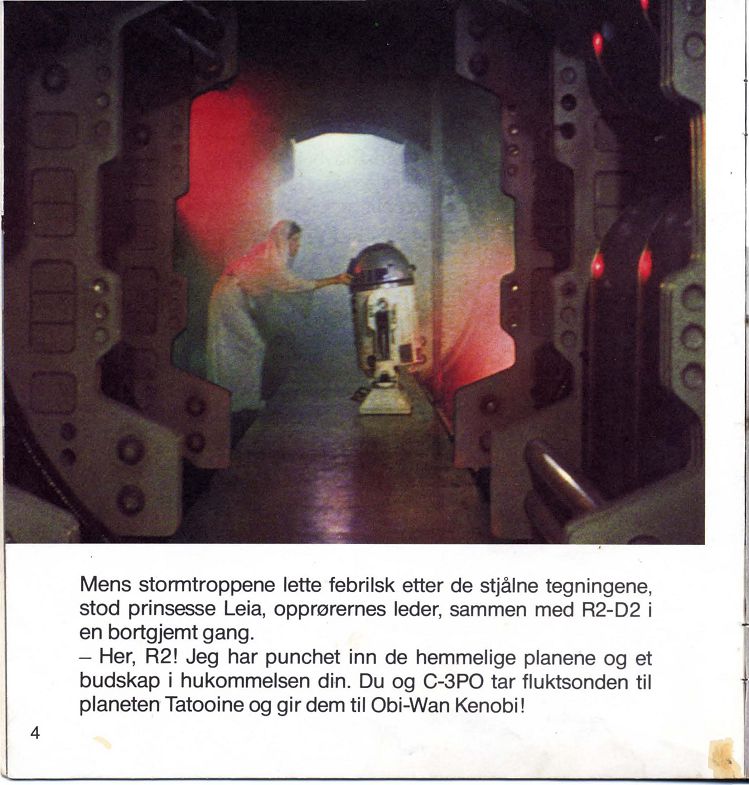 Mens stormtroppene lette febrilsk etter de stjålne tegningene, stod prinsesse Leia, opprørernes leder, sammen med R2-D2 i en bortgjemt gang. - Her, R2! Jeg har punchet inn de hemmelige planene og et budskap i hukommelsen din. Du og C-3PO tar fluktsonden til planeten Tatooine og gir dem til Obi-Wan Kenobi!