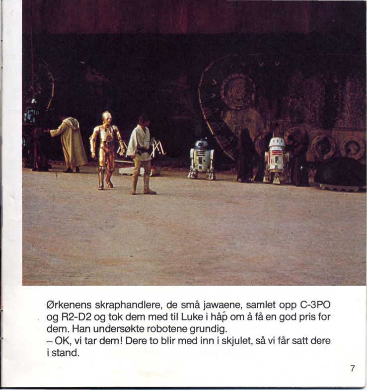 Ørkenens skraphandlere, de små jawaene, samlet opp C-3PO og R2-D2 og tok dem med til Luke i håp om å få en god pris for dem. Han undersøkte robotene grundig. - OK, vi tar dem! Dere to blir med inn i skjulet, så vi får satt dere i stand.