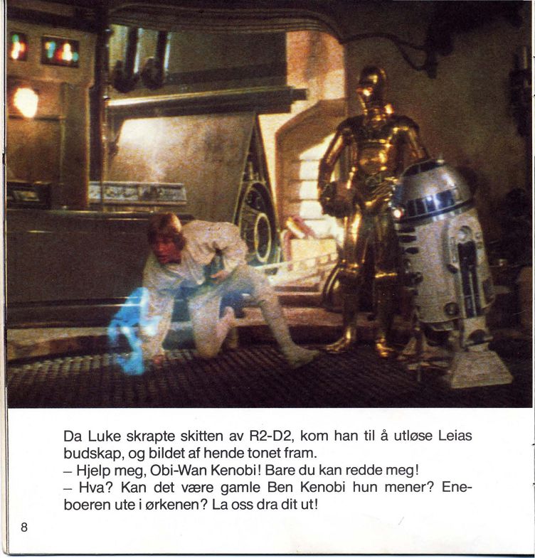 Da Luke skrapte skitten av R2-D2, kom han til å utløse Leias budskap, og bildet af hende tonet fram. - Hjelp meg, Obi-Wan Kenobi! Bare du kan redde meg! - Hva? Kan det være gamle Ben Kenobi hun mener? Eneboeren ute i ørkenen? La oss dra dit ut!
