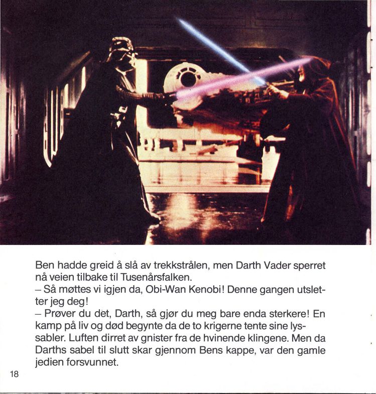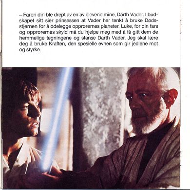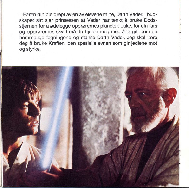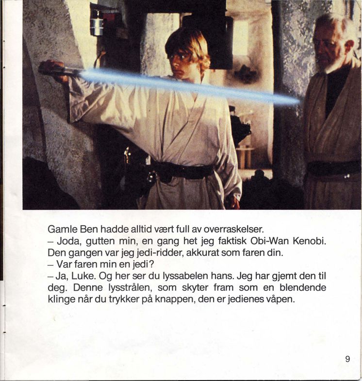 Gamle Ben hadde alltid vært full av overraskelser. - Joda, gutten min, en gang het jeg faktisk Obi-Wan Kenobi. Den gangen var jeg jedi-ridder, akkurat som faren din. - Var faren min en jedi? - Ja, Luke. Og her ser du Iyssabelen hans. Jeg har gjemt den til deg. Denne lysstrålen, som skyter fram som en blendende klinge når du trykker på knappen, den er jedienes våpen.