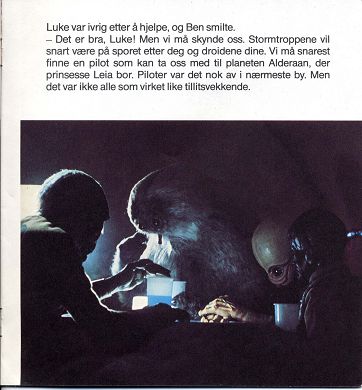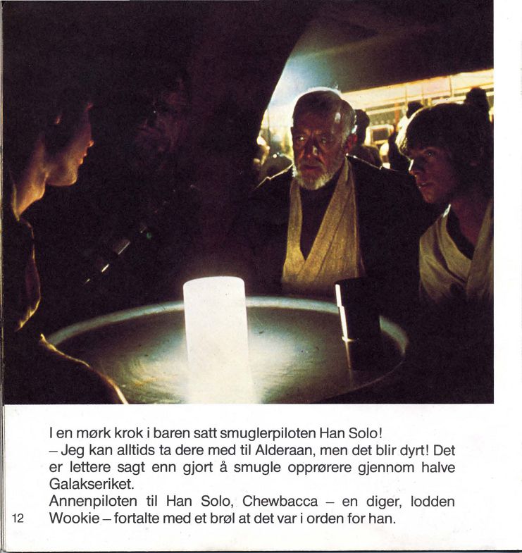 I en mørk krok i baren satt smuglerpiloten Han Solo! - Jeg kan alltids ta dere med til Alderaan, men det blir dyrt! Det er lettere sagt enn gjort å smugle opprørere gjennom halve Galakseriket. Annenpiloten til Han Solo, Chewbacca - en diger, lodden Wookie - fortalte med et brøl at det var i orden for han.