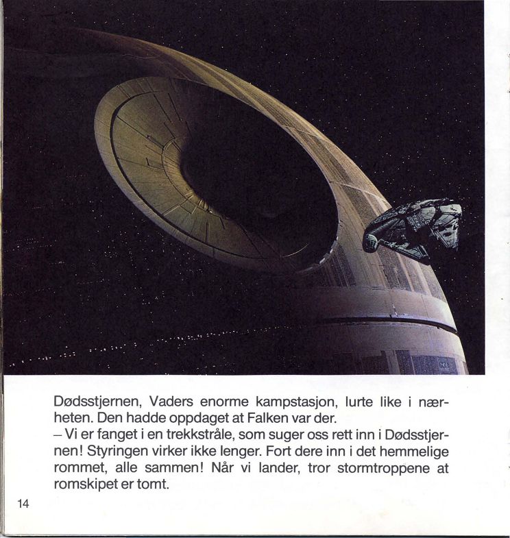 Dødsstjernen, Vaders enorme kampstasjon, lurte like i nærheten. Den hadde oppdaget at Falken var der. - Vi er fanget i en trekkstråle, som suger oss rett inn i Dødsstjernen!Styringen virker ikke lenger. Fort dere inn i det hemmelige rommet, alle sammen! Når vi lander, tror stormtroppene at romskipet er tomt.