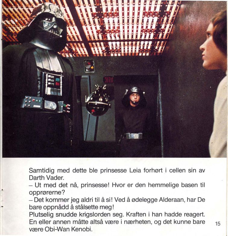 Samtidig med dette ble prinsesse Leia forhørt i cellen sin av Darth Vader. - Ut med det nå, prinsesse! Hvor er den hemmelige basen til opprørerne? - Det kommer jeg aldri til å si! Ved å ødelegge Alderaan, har De bare oppnådd å stålsette meg! Plutselig snudde krigslorden seg. Kraften i han hadde reagert. En eller annen måtte altså være i nærheten, og det kunne bare være Obi-Wan Kenobi.