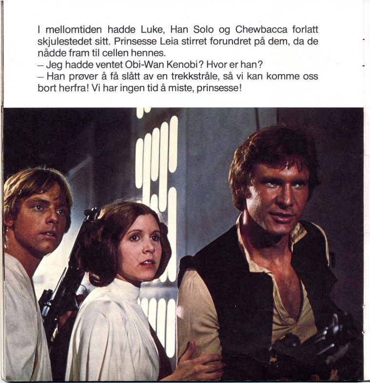 I mellomtiden hadde Luke, Han Solo og Chewbacca forlatt skjulestedet sitt. Prinsesse Leia stirret forundret på dem, da de nådde fram til cellen hennes. - Jeg hadde ventet Obi-Wan Kenobi? Hvor er han? - Han prøver å få slått aven trekkstråle, så vi kan komme oss bort herfra! Vi har ingen tid å miste, prinsesse!
