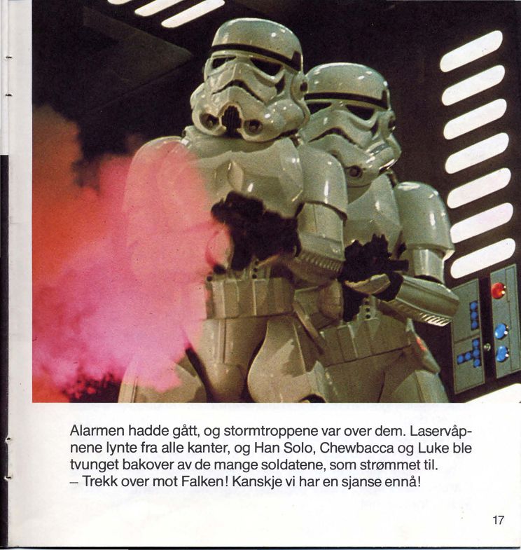 Alarmen hadde gått, og stormtroppene var over dem. Laservåpnene lynte fra alle kanter, og Han Solo, Chewbacca og Luke ble tvunget bakover av de mange soldatene, som strømmet til. - Trekk over mot Falken! Kanskje vi har en sjanse ennå!