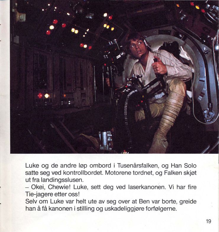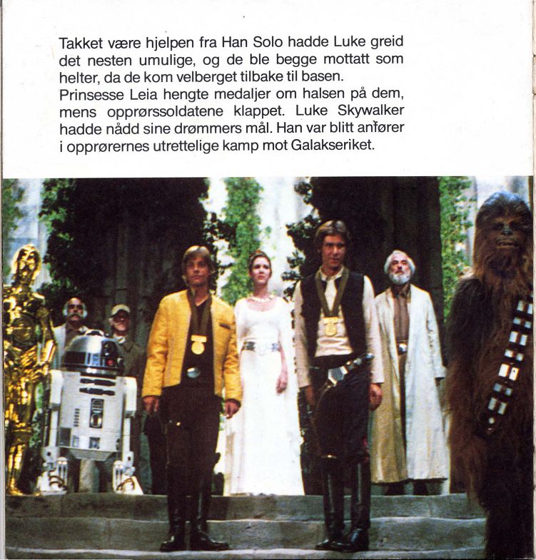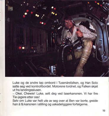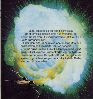 Vader tok sikte og var klar til å trykke av, da et romskip med ett strøk ned over dem, og virvlet Tie-jageren ut i verdensrommet. Det var Han Solo4 Tusenårsfalken ! - Okei, kompis! Da er resten opp til deg! Men den neste stemmen Luke hørte, var Ben Kenobis.- Du må bruke kraften, Luke! La den styre det du gjør! Luke lukket øynene, konsentrerte seg og fyrte av proton-torpedoene. De suste rett ned i den 9 pende sjakten, og da han svingte unna, eksploderte Dødsstjernen i et flammehav.