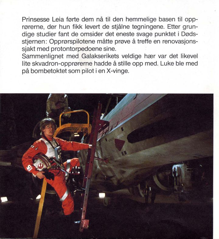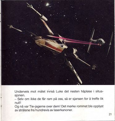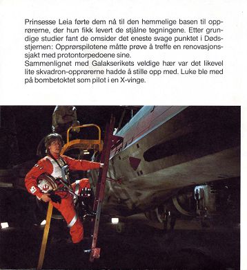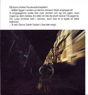 Så kom ordren fra skvadronsjefen! - Målet ligger i enden av denne rennen! Start angrepet nå! X-vingejagerne suste like over rennen om og om igjen, men· ingen av dem lykkes. En etter en ble de skutt ned av Tie-jagerne. Da Luke tordnet ned i rennen, kom han til å kaste et blikk bakover. - A nei! Det er Darth Vader! Like bak meg!
