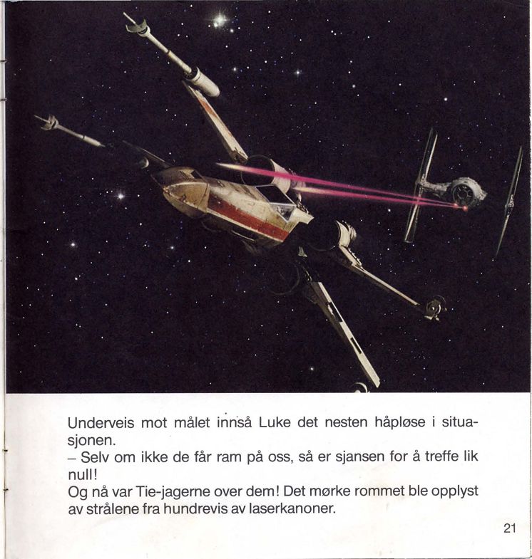 Underveis mot målet inn·så Luke det nesten håpløse i situasjonen. - Selv om ikke de får ram på oss, så er sjansen for å treffe lik null ! Og nå var Tie-jagerne over dem! Det mørke rommet ble opplyst av strålene fra hundrevis av laserkanoner.