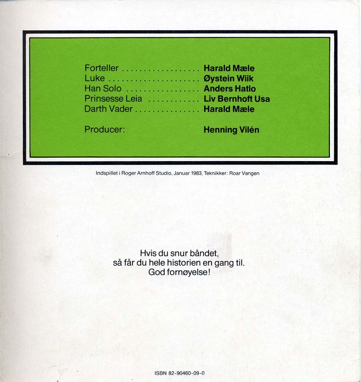 Forteller: Harald Mæle Luke: Øystein WIik Han Solo: Anders Hatlo Prinsesse Leia: Liv Bernhoft Usa Darth Vader: Harald Mæle Producer: Henning Vllen