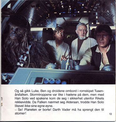 Og så gikk Luke, Ben og droidene ombord i romskipet Tusenårsfalken. Stormtroppene var like i hælene på dem, men med Han Solo ved spakene kom de seg i sikkerhet utenfor Rikets rekkevidde. Da Falken nærmet seg Alderaan, trodde Han Solo likevel ikke sine egne øyne. - Se! Planeten er borte! Darth Vader må ha sprengt den til atomer!
