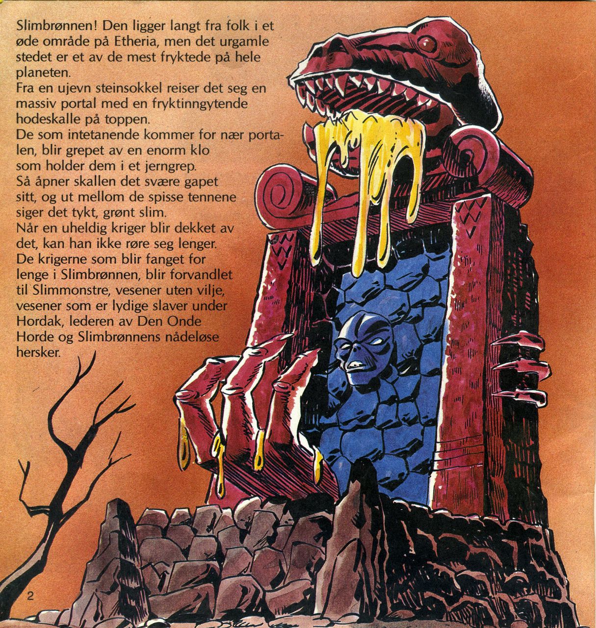 Slimbrønnen! Den ligger langt fra folk i et øde område på Etheria, men det urgamle stedet er et av de mest fryktede på hele planeten. Fra en ujevn steinsokkel reiser det seg en massiv portal med en fryktinngytende hodeskalle på toppen. De som intetanende kommer for nær portalen, blir grepet av en enorm klo som holder dem i et jerngrep. Så åpner skallen det svære gapet sitt, og ut mellom de spisse tennene siger det tykt, grønt slim. Når en uheldig kriger blir dekket av det, kan han ikke røre seg lenger. De krigerne som blir fanget for lenge i Slimbrønnen, blir forvandlet til Slimmonstre, vesener uten vilje, vesener som er lydige slaver under Hordak, lederen av Den Onde Horde og Slimbrønnens nådeløse hersker.