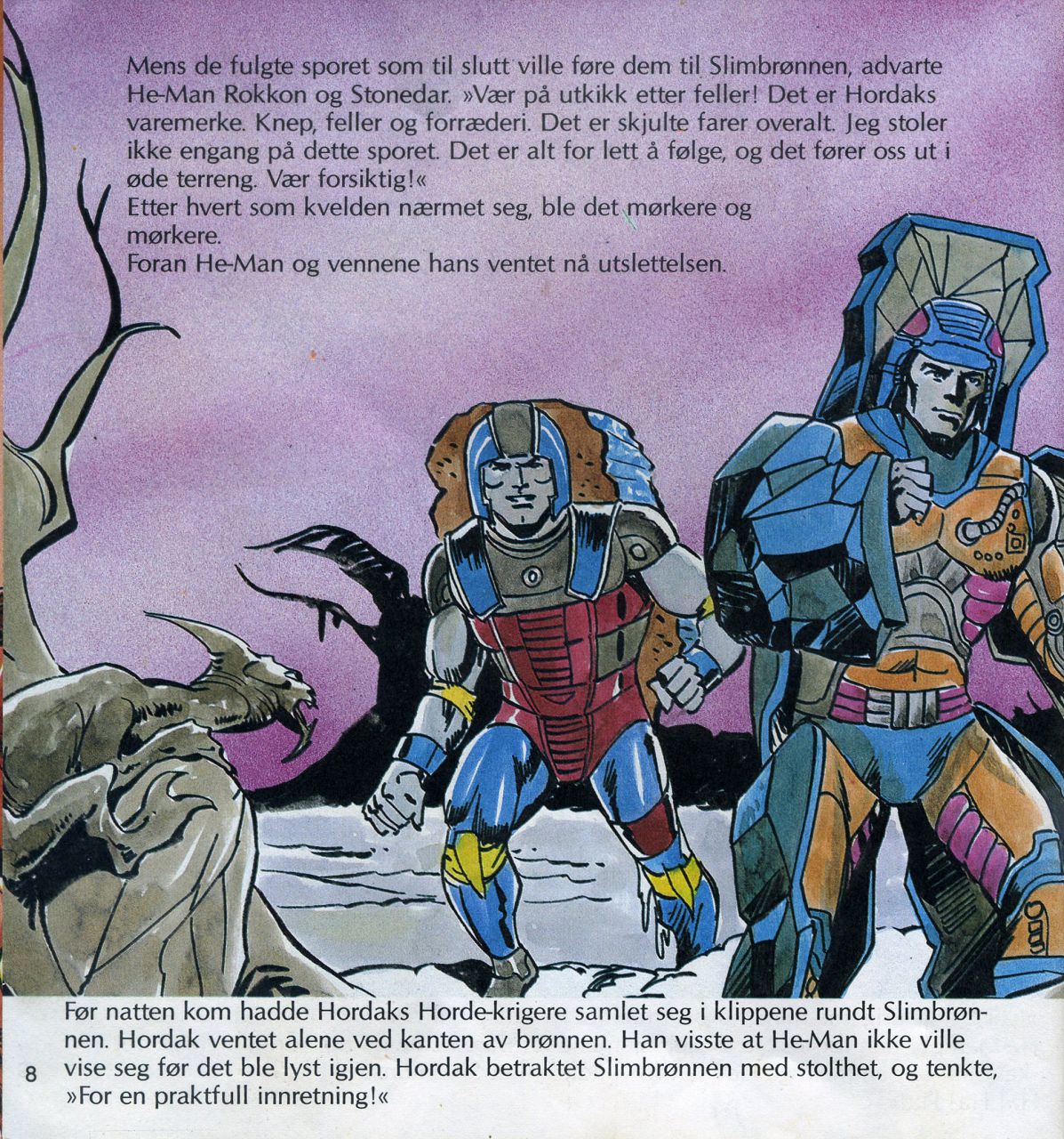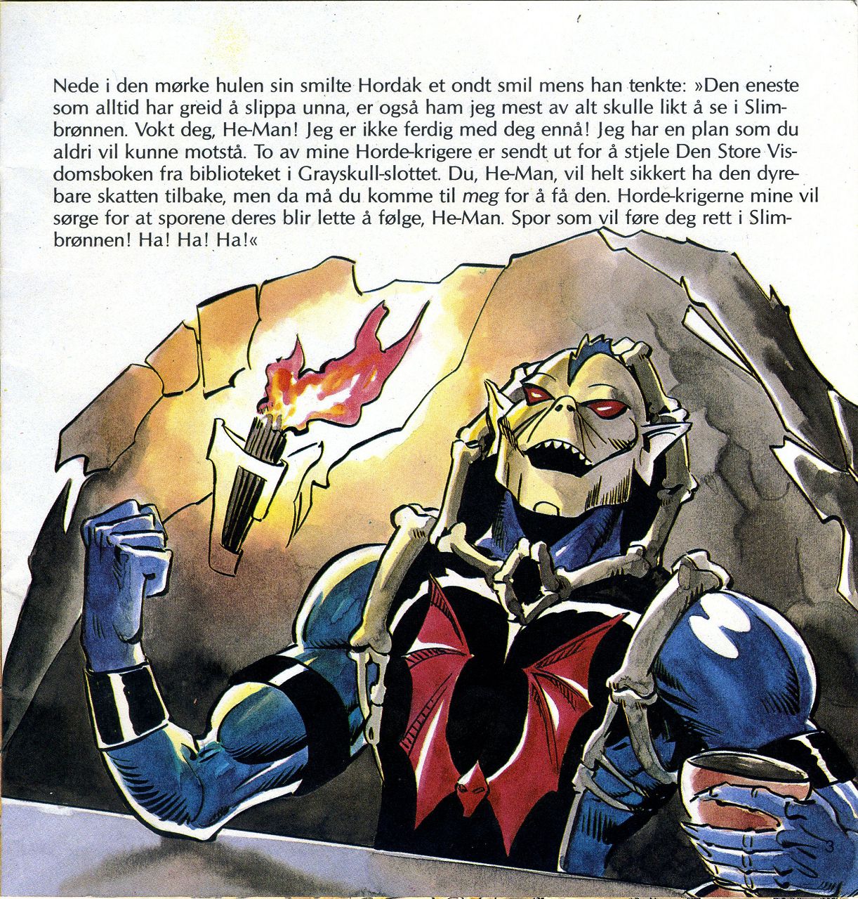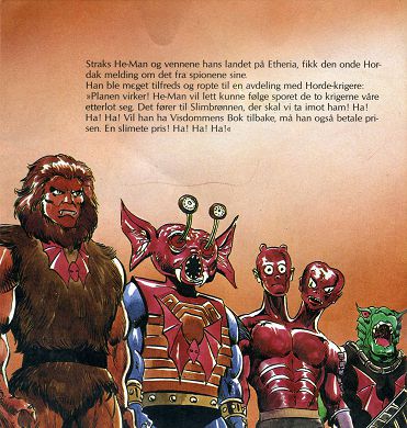 Nede i den mørke hulen sin smilte Hordak et ondt smil mens han tenkte: "Den eneste som alltid har greid å slippa unna, er også ham jeg mest av alt skulle likt å se i Slimbrønnen. Vokt deg, He-Man! Jeg er ikke ferdig med deg ennå! Jeg har en plan som du aldri vil kunne motstå. To av mine Horde-krigere er sendt, ut for å stjele Den Store Visdomsboken fra biblioteket i Grayskull-slottet. Du, He-Man, vil helt sikkert ha den dyrebare skatten tilbake, men da må du komme til meg for å få den. Horde-krigerne mine vil sørge for at sporene deres blir lette å følge, He-Man. Spor som '1 føre deg rett i Slimbrønnen! Ha! Ha! Ha!"