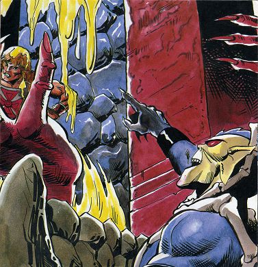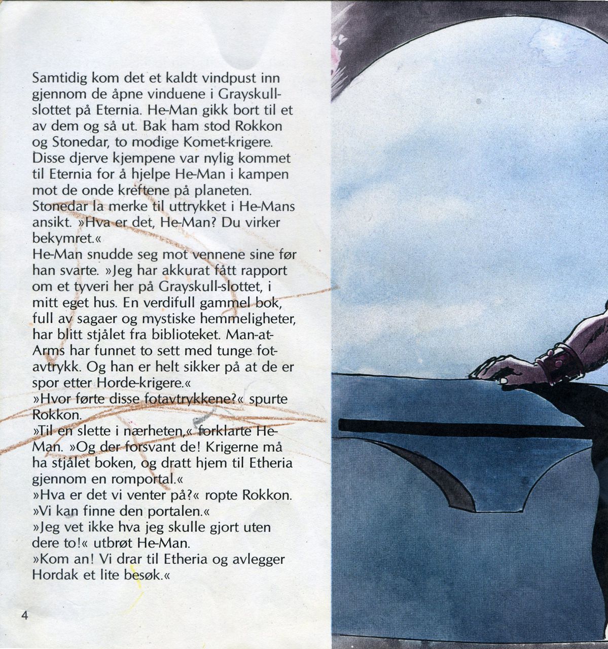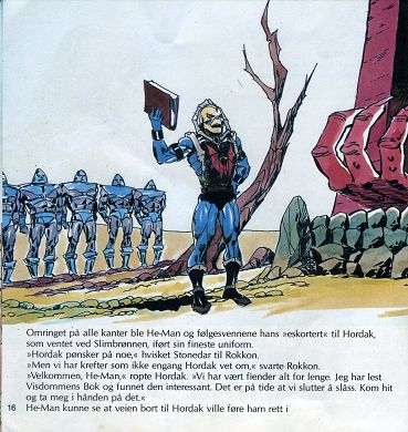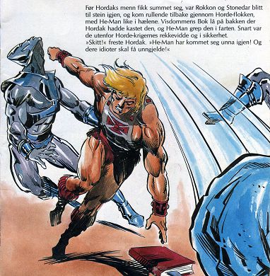 Samtidig kom det et kaldt vindpust inn gjennom de åpne vinduene i Grayskullslottet på Eternia. He-Man gikk bort til et av dem og så ut. Bak ham stod Rokkon og Stonedar, to modige Komet-krigere. Disse djerve kjempene var nylig kommet til Eternia for å hjelpe He-Man i kampen mot de onde kreftene på planeten. Stonedar la merke til uttrykket i He-Mans ansikt. "Hva er det, He-Man? Du virker bekymret." He-Man snudde seg mot vennene sine før han svarte."Jeg har akkurat fått rapport om et tyveri her på Grayskull-slottet, i mitt eget hus. En verdifull gammel bok: full av sagaer og mystiske hemmeligheter, har blitt stjålet fra biblioteket. Man-atArms har funnet to sett med tunge fotavtrykk. Og han er helt sikker på at de er spor etter Horde-krigere." "Hvor førte disse fotavtrykkene" spurte Rokkon. "Til en slette i nærheten, forklarte He-Man" Og der forsvant de! Krigerne må ha stjålet boken, og dratt hjem til Etheria gjennom en romportal." "Hva er det vi venter på?" ropte Rokkon. "Vi kan finne den portalen." "Jeg vet ikke hva jeg skulle gjort uten dere to!" utbrøt He-Man. "Kom an! Vi drar til Etheria og avlegger Hordak et lite besøk."