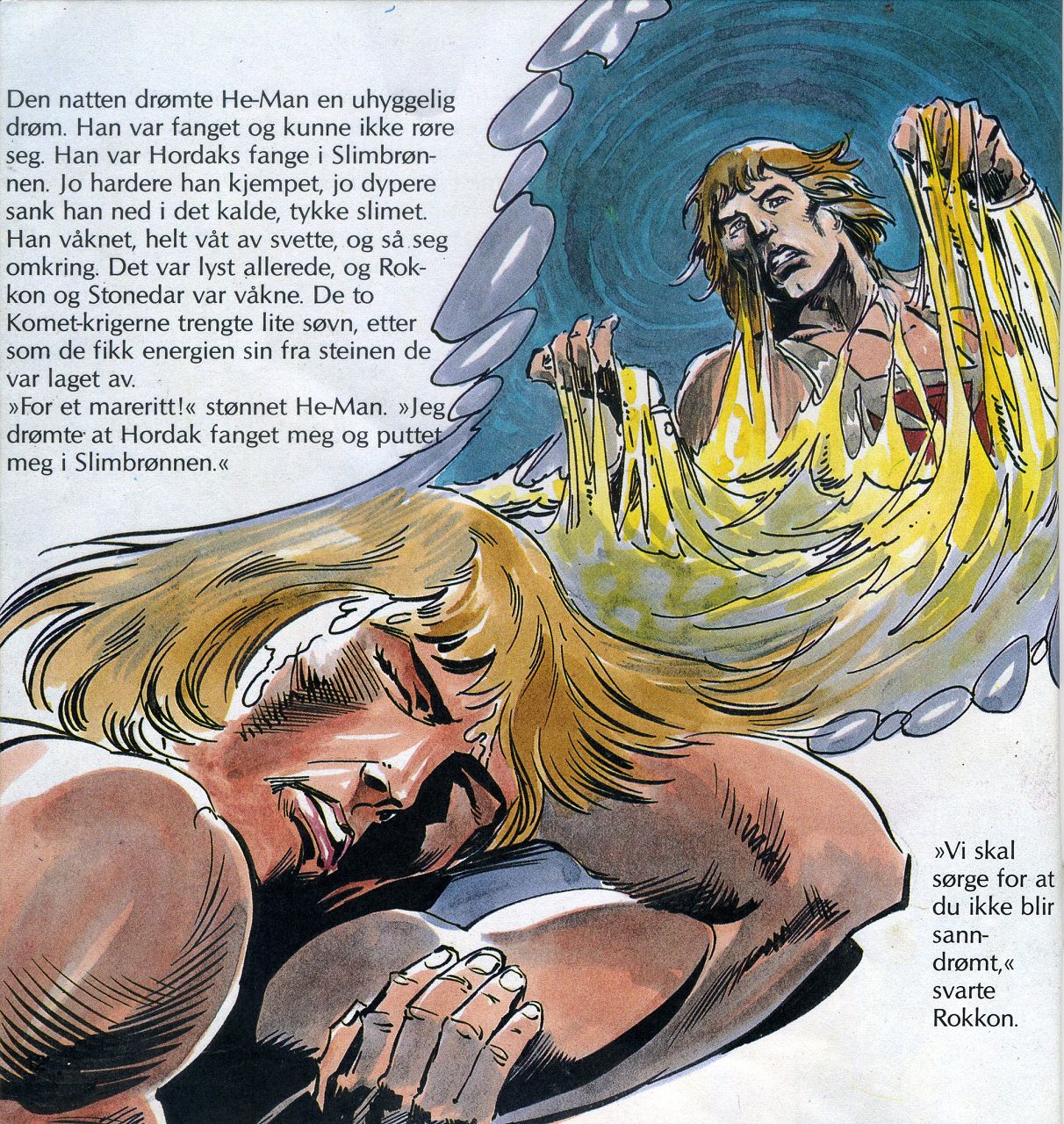 Den natten drømte He-Man en uhyggelig drøm. Han var fanget og kunne ikke røre seg. Han var Hordaks fange i Slimbrønnen. Jo hardere han kjempet, jo dypere sank han ned i det kalde, tykke slimet. Han våknet, helt våt av svette, og så seg omkring. Det var lyst allerede, og Rokkon og Stonedar var våkne. De to Komet-krigerne trengte lite søvn, etter som de fikk energien sin fra steinen de var laget av. "For et mareritt!" stønnet He-Man. "Jeg drømte at Hordak fanget meg og puttet meg i Slimbrønnen." "Vi skal sørge for at du ikke blir sanndrømt," svarte Rokkon.