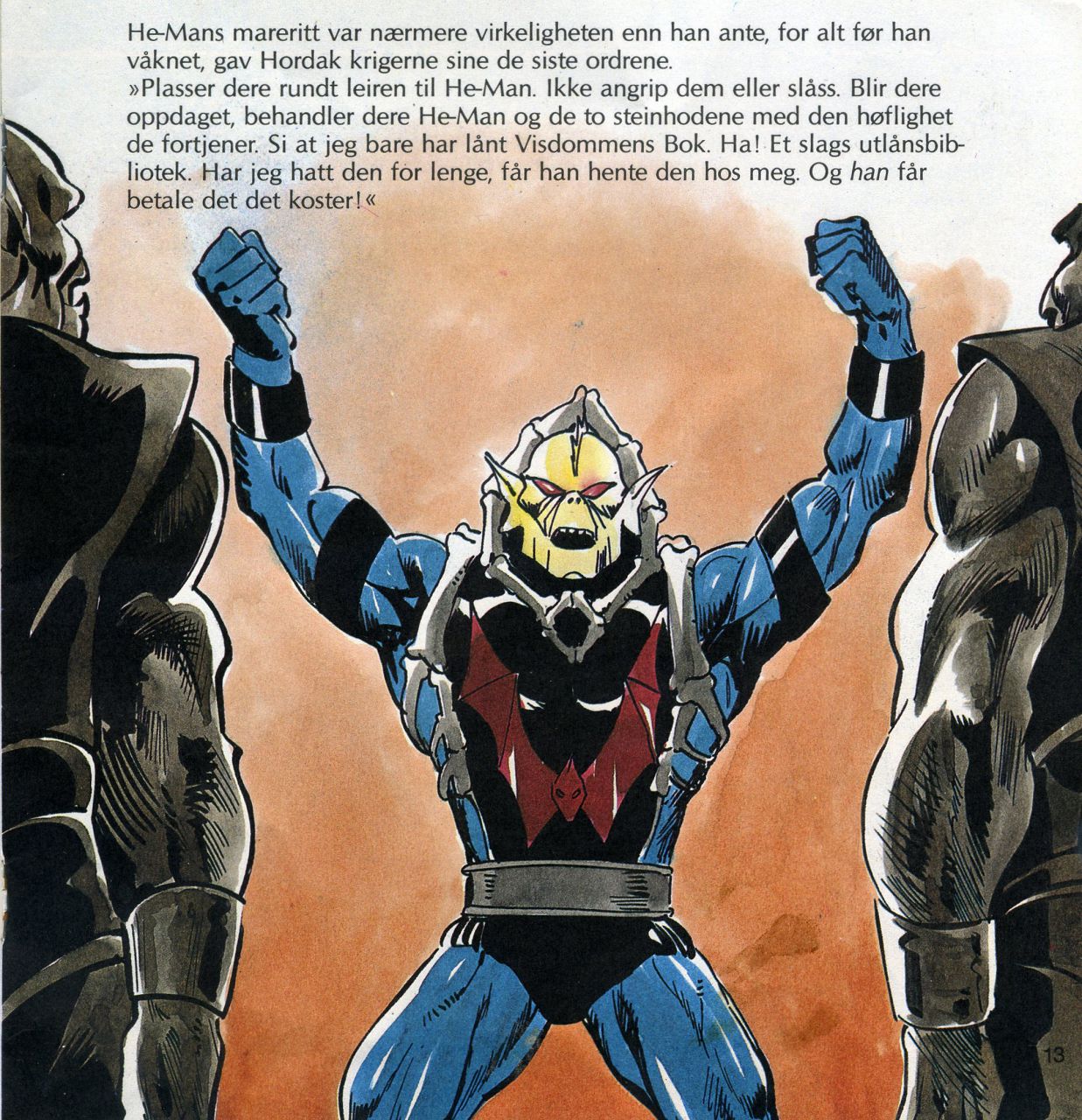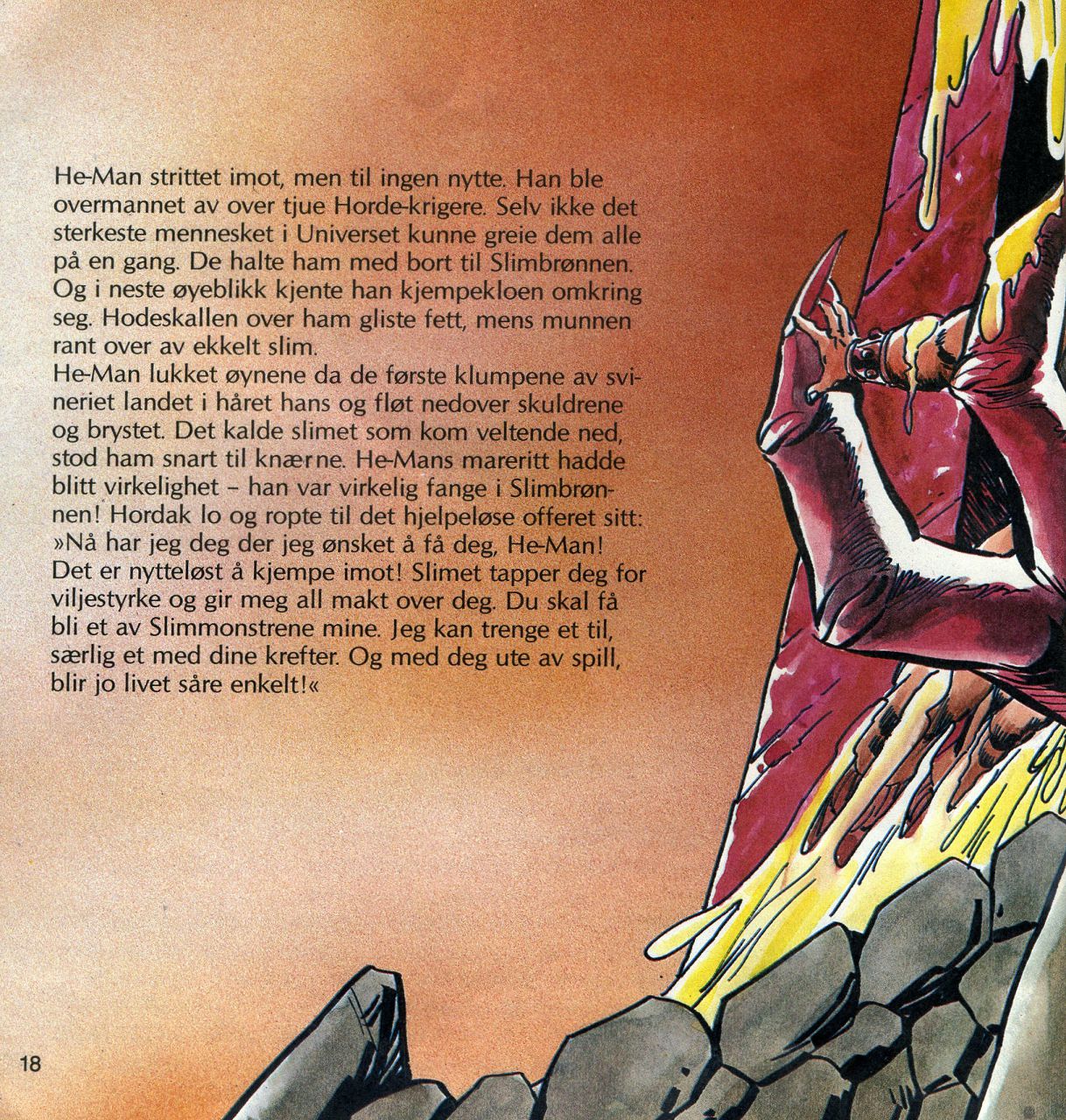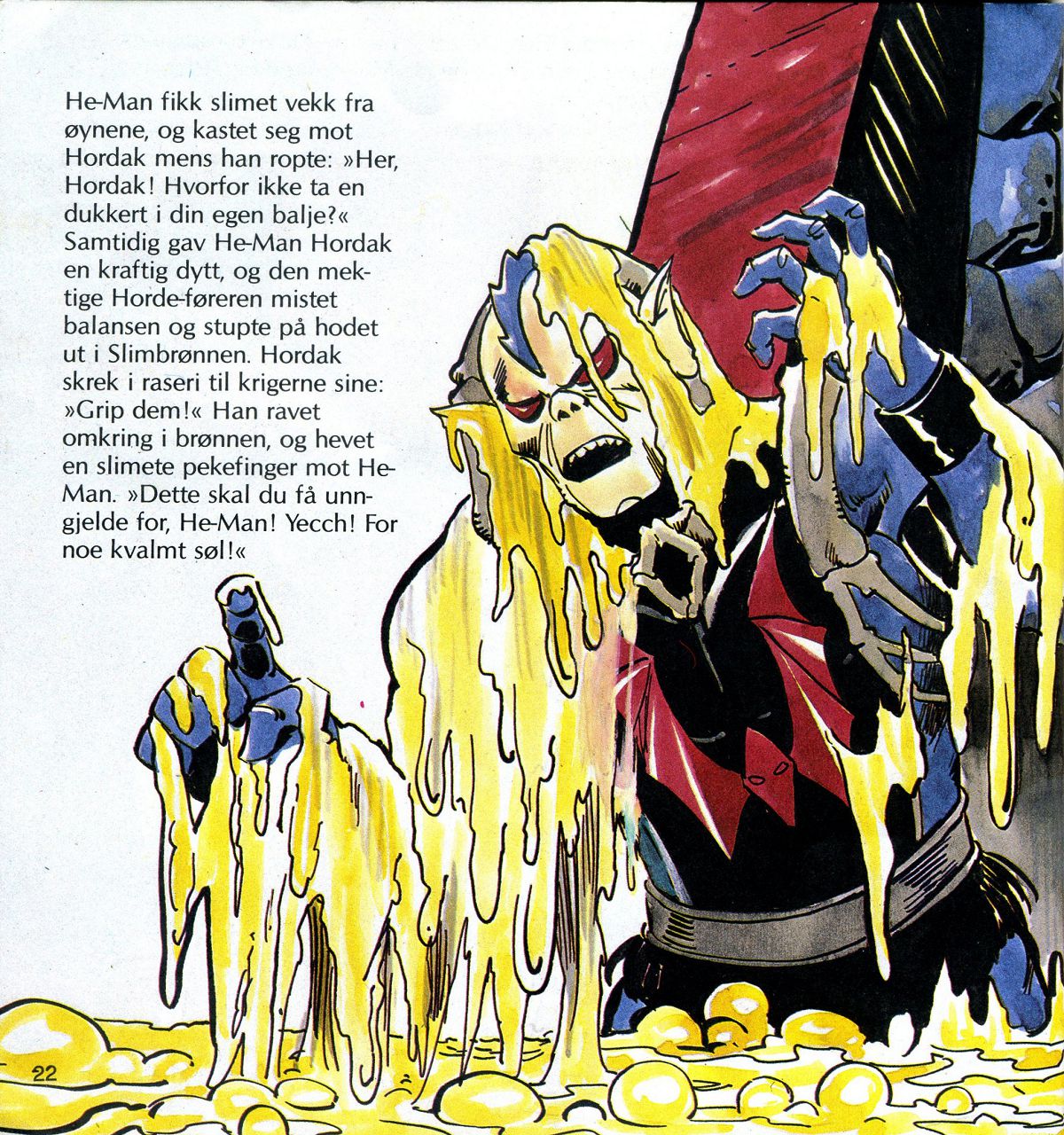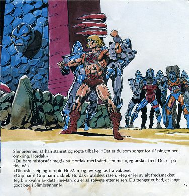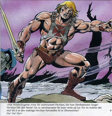 "Når Horde-krigerne mine får overmannet He-Man, blir han Slimbrønnens fange! He-Man blir den første! De to steinhjernene får bare vente på tur. For en nytelse det skal bli å se den mektige He-Man forvandles til et Slimmonster! Ha! Ha! Ha!"