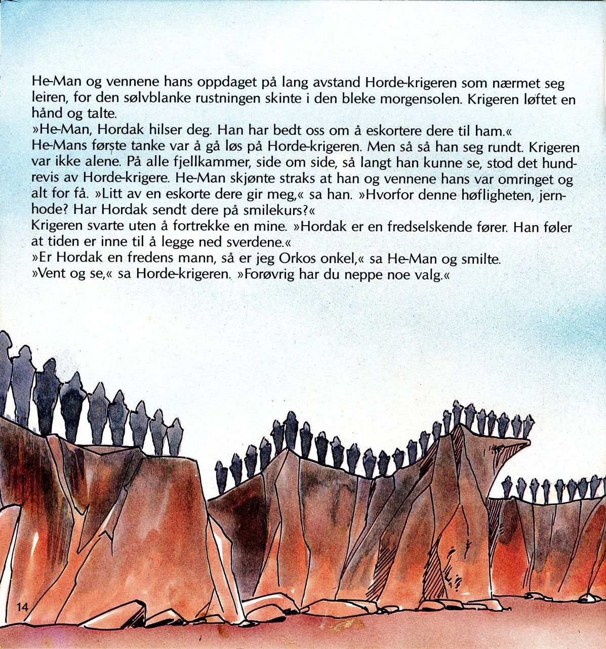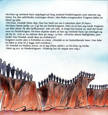He-Man og vennene hans oppdaget på lang avstand Horde-krigeren som nærmet seg leiren, for den sølvblanke rustningen skinte i den bleke morgensolen. Krigeren løftet en hånd og talte. "He-Man, Hordak hilser deg. Han har bedt oss om å eskortere dere til ham." He-Mans første tanke var å gå løs på Horde-krigeren. Men så så han seg rundt. Krigeren var ikke alene. På alle fjellkammer, side om side, så langt han kunne se, stod det hundrevis av Horde-krigere. He-Man skjønte straks at han og vennene hans var omringet og alt for få. "Litt av en eskorte dere gir meg," sa han. "Hvorfor denne høfligheten, jernhode? Har Hordak sendt dere på smilekurs?" Krigeren svarte uten å fortrekke en mine. "Hordak er en fredselskende fører. Han føler at tiden er inne til å legge ned sverdene." Er Hordak en fredens mann, så er jeg Orkos onkel," sa He-Man og smilte. "Vent og se," sa Horde-krigeren. "Forøvrig har du neppe noe valg."