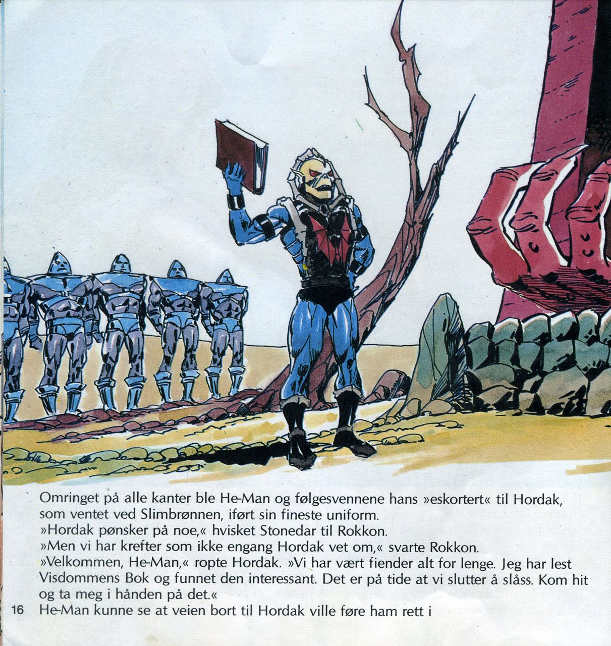 Omringet på alle kanter ble He-Man og følgesvennene hans "eskortert" til Hordak, som ventet ved Slimbrønnen, iført sin fineste uniform. "Hordak pønsker på noe," hvisket Stonedar til Rokkon. "Men vi har krefter som ikke engang Hordak vet om," svarte Rokkon. "Velkommen, He-Man," ropte Hordak. "Vi har vært fiender alt for lenge. Jeg har lest Visdommens Bok og funnet den interessant. Det er på tide at vi slutter å slåss. Kom hit og ta meg i hånden på det." He-Man kunne se at veien bort til Hordak ville føre ham rett i