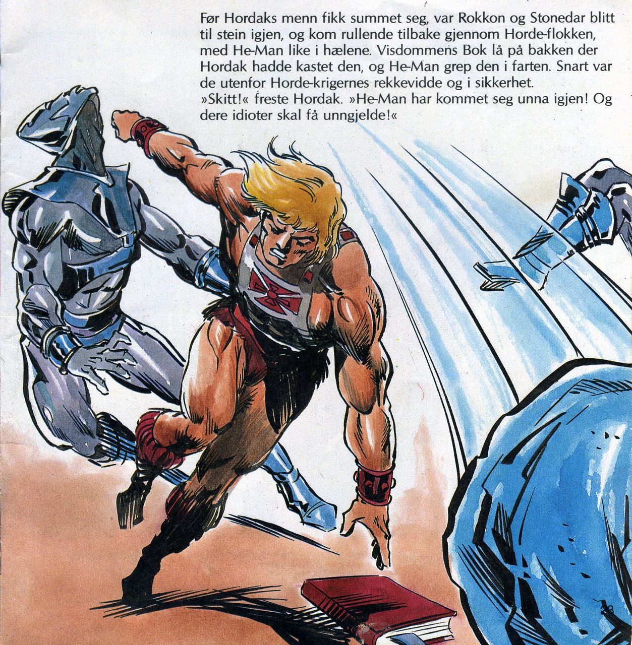 Før Hordaks menn fikk summet seg, var Rokkon og Stonedar blitt til stein igjen, og kom rullende tilbake gjennom Horde-flokken, med He-Man like i hælene. Visdommens Bok lå på bakken der Hordak hadde kastet den, og He-Man grep den i farten. Snart var de utenfor Horde-krigernes rekkevidde og i sikkerhet. "Skitt!" freste Hordak. "He-Man har kommet seg unna igjen! Og dere idioter skal få unngjelde!"