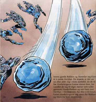 Imens gjorde Rokkon og Stonedar seg klare til å redde He-Man. De skjønte at det var nå eller aldri. Og i neste øyeblikk slo de til før Horde-krigerne kunne stanse dem, forvandlet de seg til digre steiner som rullet gjennom Horde-flokken og rett fram mot He-Man i Slimbrønnen. For ikke å bli knust kastet Horde-krigerne seg unna der Rokkon og Stonedar kom dundrende.
