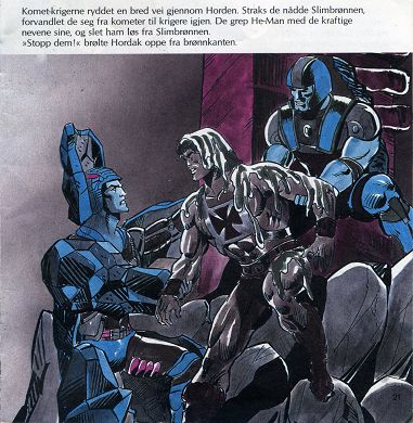 Komet-krigerne ryddet en bred vei gjennom Horden. Straks de nådde Slimbrønnen, forvandlet de seg fra kometer til krigere igjen. De grep He-Man med de kraftige nevene sine, og slet ham løs fra Slimbrønnen. "Stopp dem!" brølte Hordak oppe fra brønnkanten.