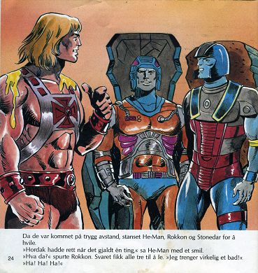 Da de var kommet på trygg avstand, stanset He-Man, Rokkon og Stonedar for å hvile. "Hordak hadde rett når det gjaldt en ting," sa He-Man med et smil. "Hva da?" spurte Rokkon. Svaret fikk alle tre til å le. "Jeg trenger virkelig et bad!" "Ha! Ha! Ha!"