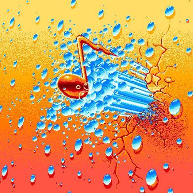 "A musical note going through a wall, breaking it with water drops and splashes"
