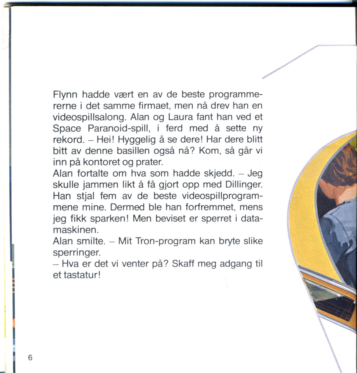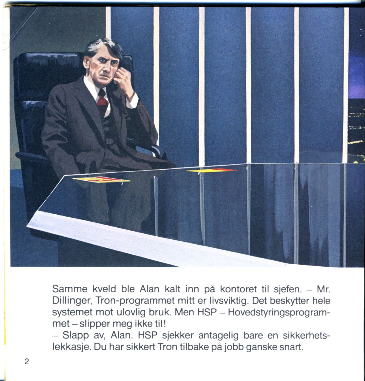 Samme kveld ble Alan kalt inn på kontoret til sjefen. - Mr. Dillinger, Tron-programmet mitt er livsviktig. Det beskytter hele systemet mot ulovlig bruk. Men HSP - Hovedstyringsprogrammet - slipper meg ikke til!