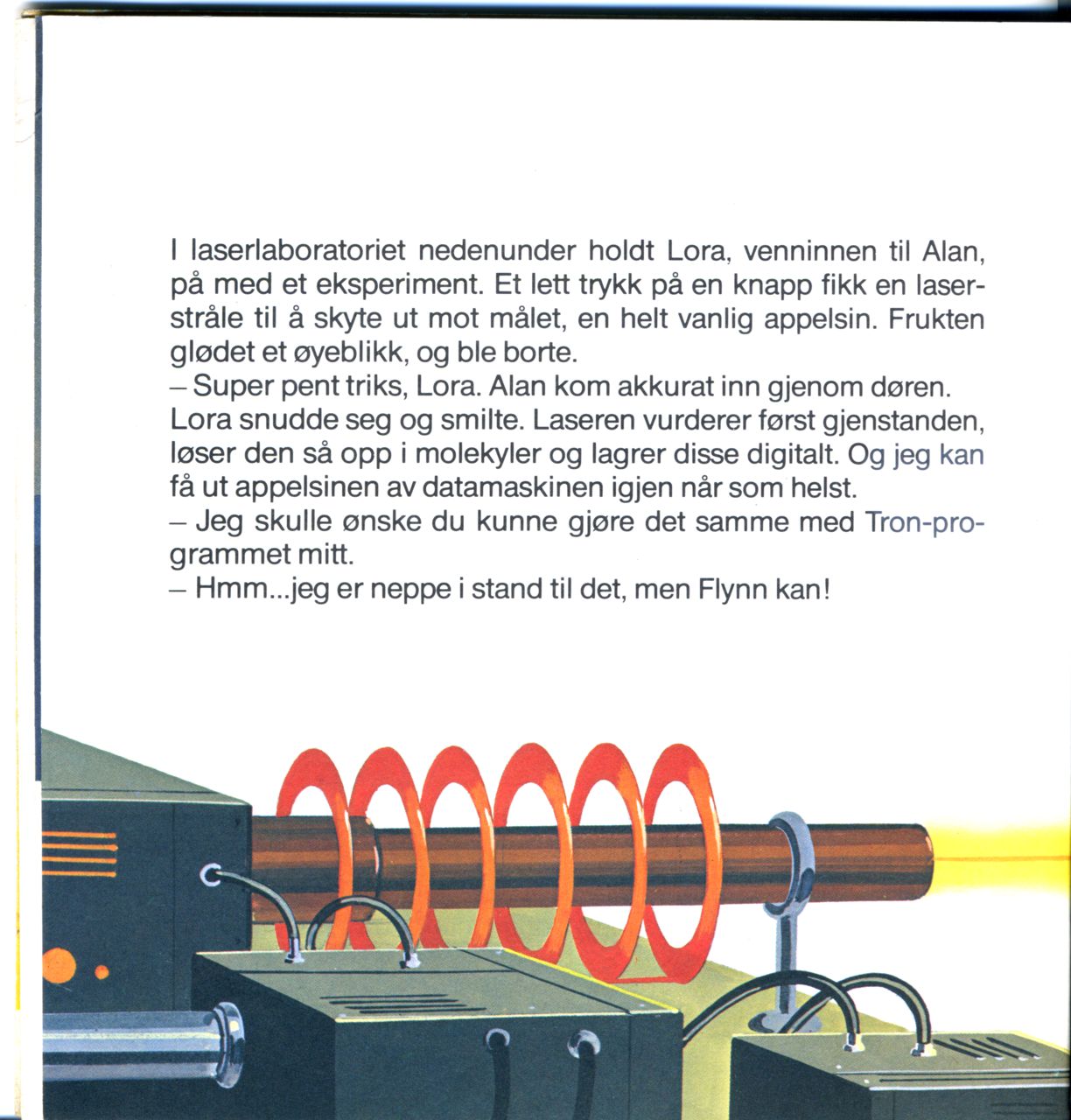 - Super pent triks, Lora. Alan kom akkurat inn gjenom døren. Lora snudde seg og smilte. Laseren vurderer først gjenstanden, løser den så opp i molekyler og lagrer disse digitalt. Og jeg kan få ut appelsinen av datamaskinen igjen når som helst.