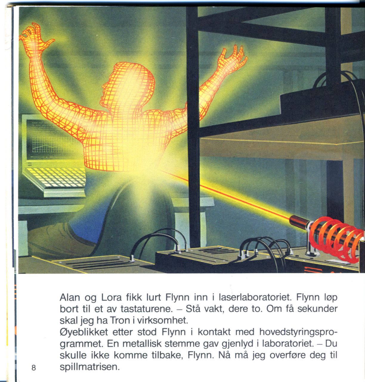 Øyeblikket etter stod Flynn i kontakt med hovedstyringsprogrammet. En metallisk stemme gav gjenlyd i laboratoriet. - Du skulle ikke komme tilbake, Flynn. Nå må jeg overføre deg til 8 spillmatrisen.