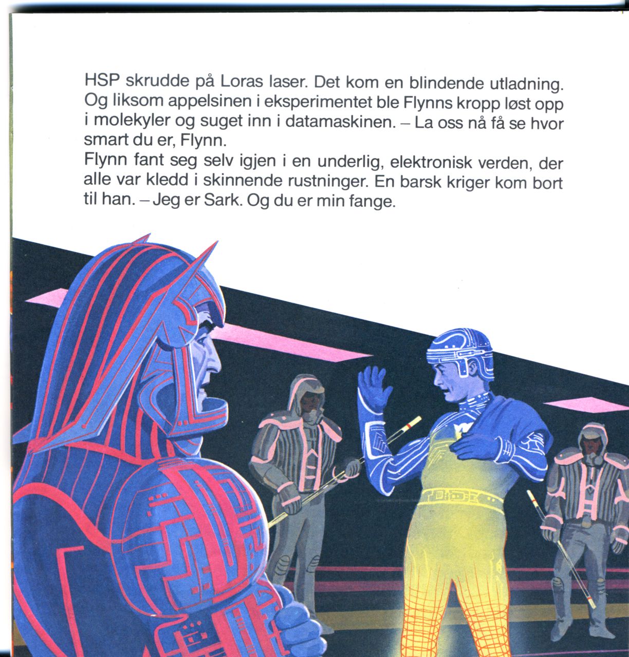 Flynn fant seg selv igjen i en underlig, elektronisk verden, der alle var kledd i skinnende rustninger. En barsk kriger kom bort til han. - Jeg er Sark. Og du er min fange.