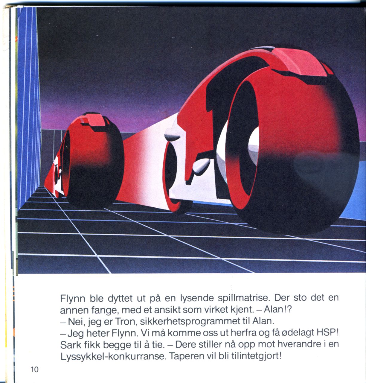 - Jeg heter Flynn. Vi må komme oss ut herfra og få ødelagt HSP! Sark fikk begge til å tie. - Dere stiller nå opp mot hverandre i en Lyssykkel-konkurranse. Taperen vil bli tilintetgjort!