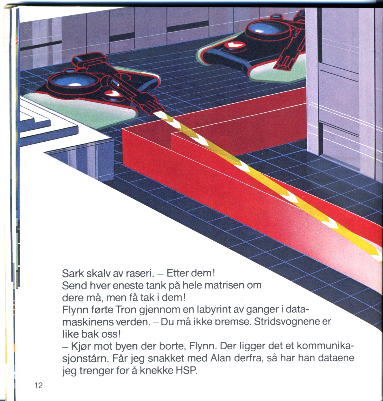 Flynn førte Tron gjennom en labyrint av ganger i datamaskinens verden. - Du må ikke bremse. Stridsvognene er li ke bak oss!