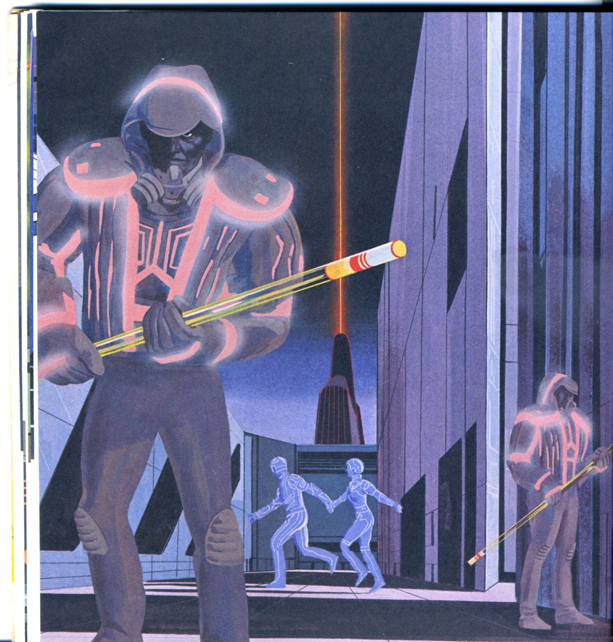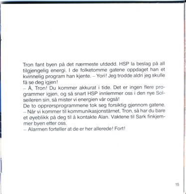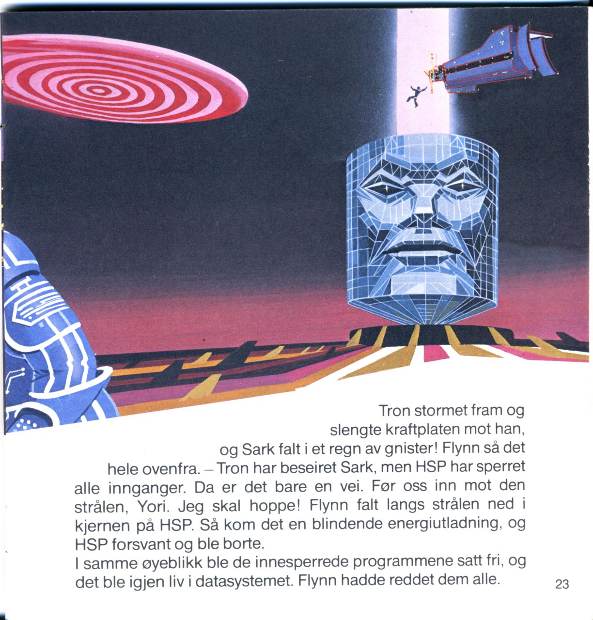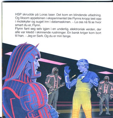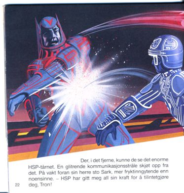 Der, i det fjerne, kunne de se det enorme HSP-tårnet. En glitrende kommunikasjonsstråle skjøt opp fra det. På vakt foran sin herre sto Sark, mer fryktinngytende enn noensinne. - HSP har gitt meg all sin kraft for å tilintetgjøre deg, Tron!