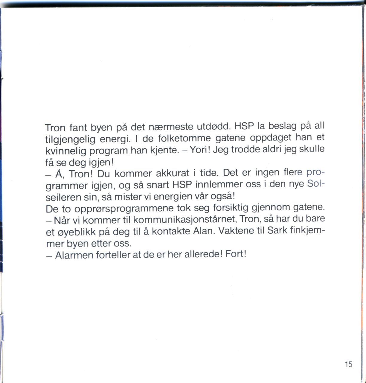 - Å, Tron! Du kommer akkurat i tide. Det er ingen flere programmer igjen, og så snart H8P innlemmer oss i den nye Sol-seileren sin, så mister vi energien vår også!