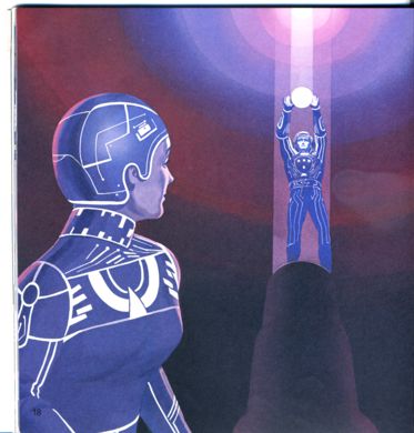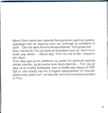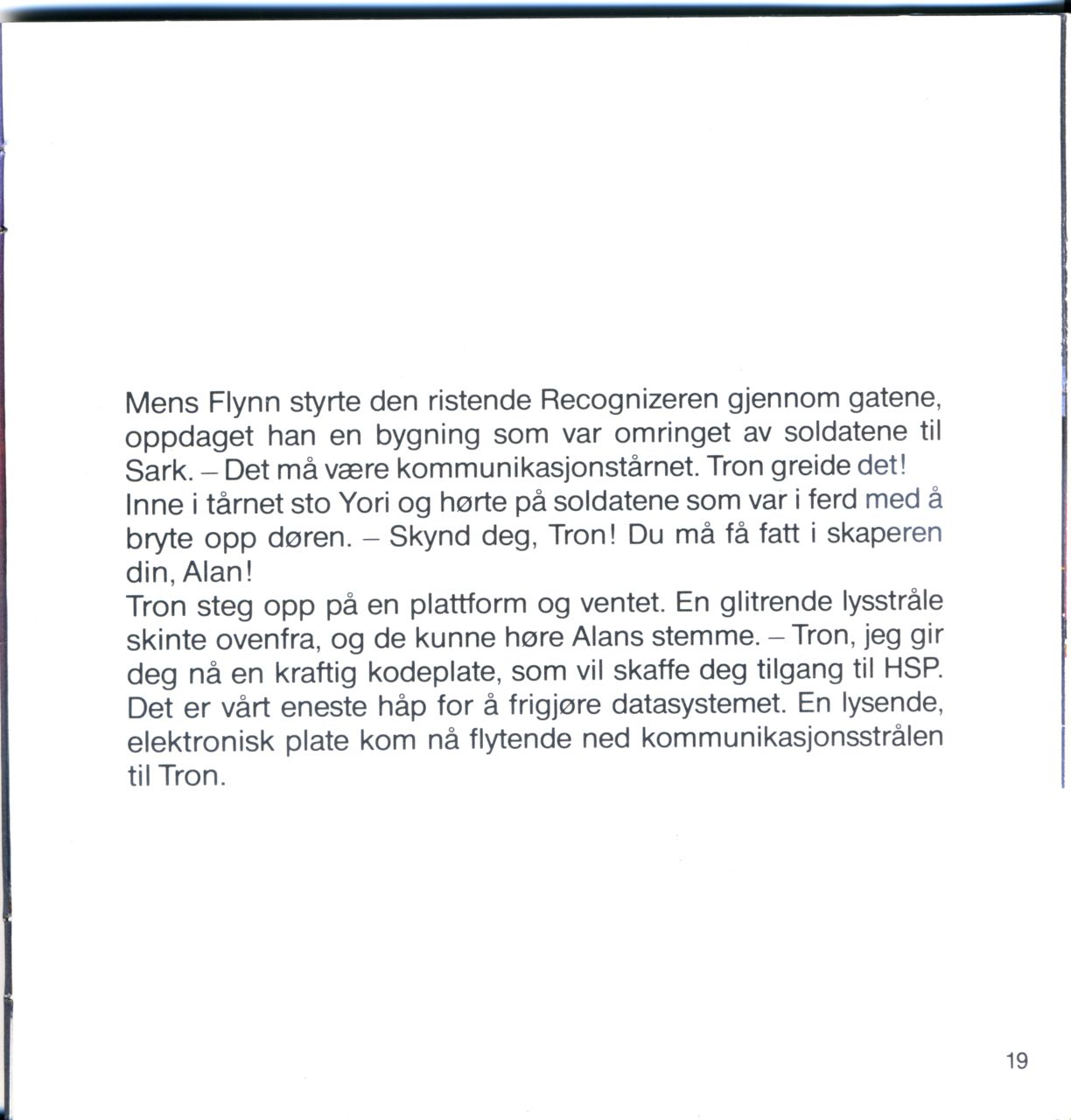 Tron steg opp på en plattform og ventet. En glitrende lysstråle skinte ovenfra, og de kunne høre Alans stemme. - Tron, jeg gir deg nå en kraftig kodeplate, som vil skaffe deg tilgang til HSP. Det er vårt eneste håp for å frigjøre datasystemet. En lysende, elektronisk plate kom nå flytende ned kommunikasjonsstrålen til Tron.