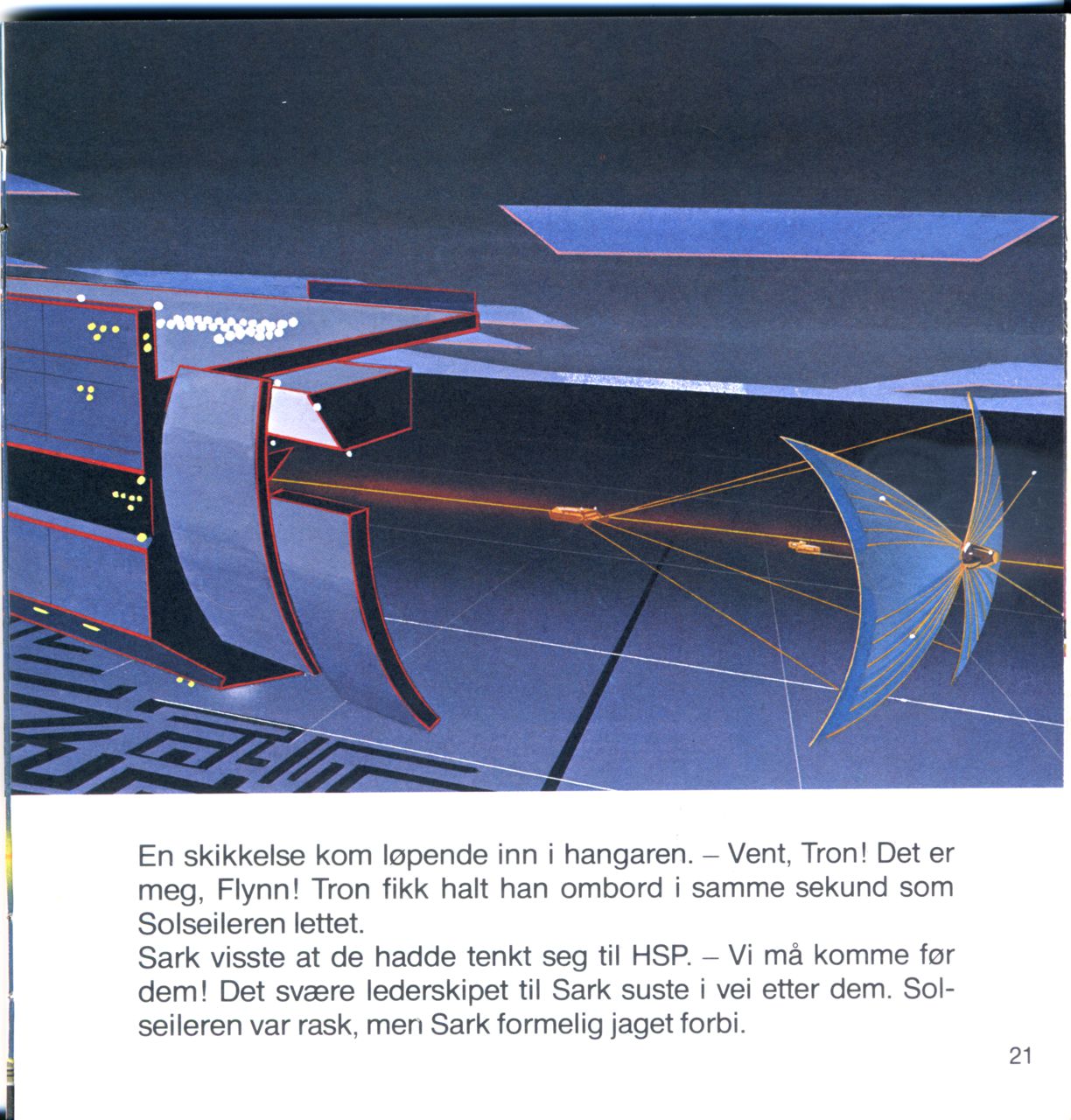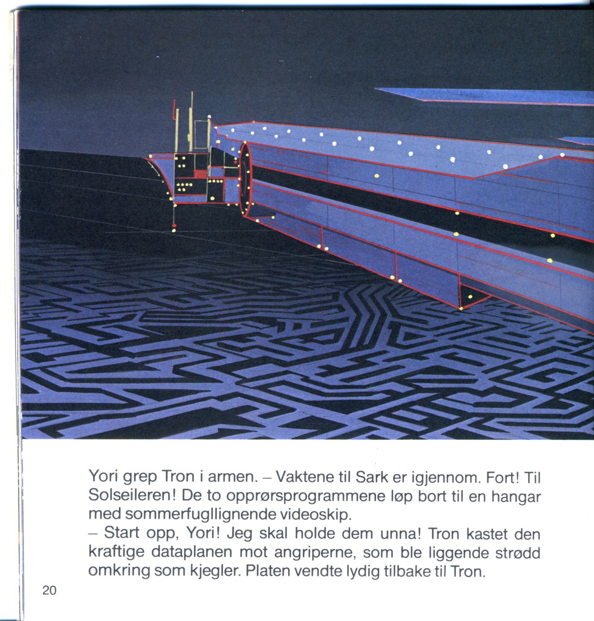 Yori grep Tron i armen. - Vaktene til Sark er igjennom. Fort! Til Solseileren! De to opprørsprogrammene løp bort til en hangar med sommerfugllignende videoskip.