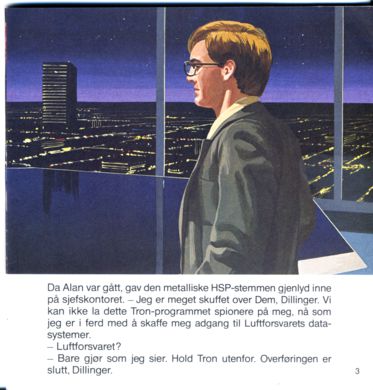 Da Alan var gått, gav den metalliske HSP-stemmen gjenlyd inne på sjefskontoret. - Jeg er meget skuffet over Dem, Dillinger. Vi kan ikke la dette Tron-programmet spionere på meg, nå som jeg er i ferd med å skaffe meg adgang til Luftforsvarets datasystemer.
