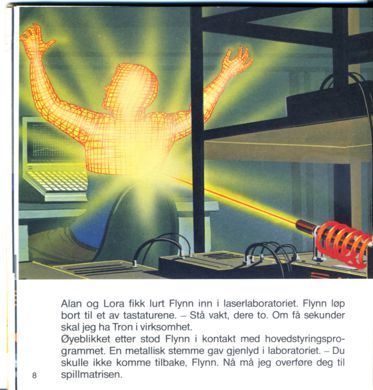 Alan og Lora fikk lurt Flynn inn i laserlaboratoriet. Flynn løp bort til et av tastaturene. - Stå vakt, dere to. Om få sekunder skal jeg ha Tron i virksomhet.