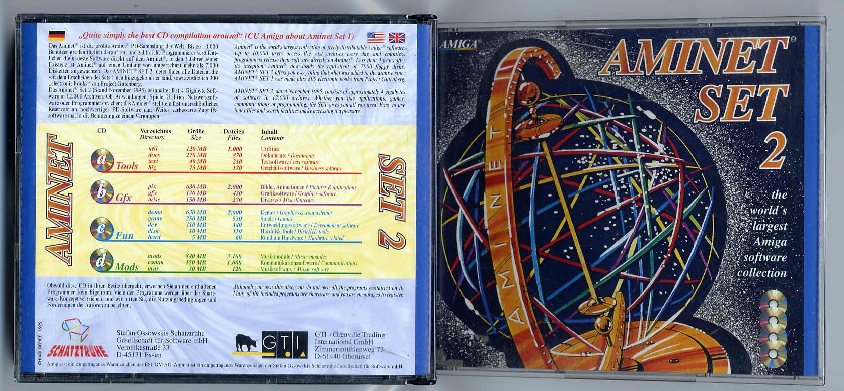 In 2009 I started a very slow project of aquiring all of the cd's in an attempt to create the ultimate search engine for these cd's. The Aminet Set CD's already came with a complete filelist and browser program, but it was not very deep.