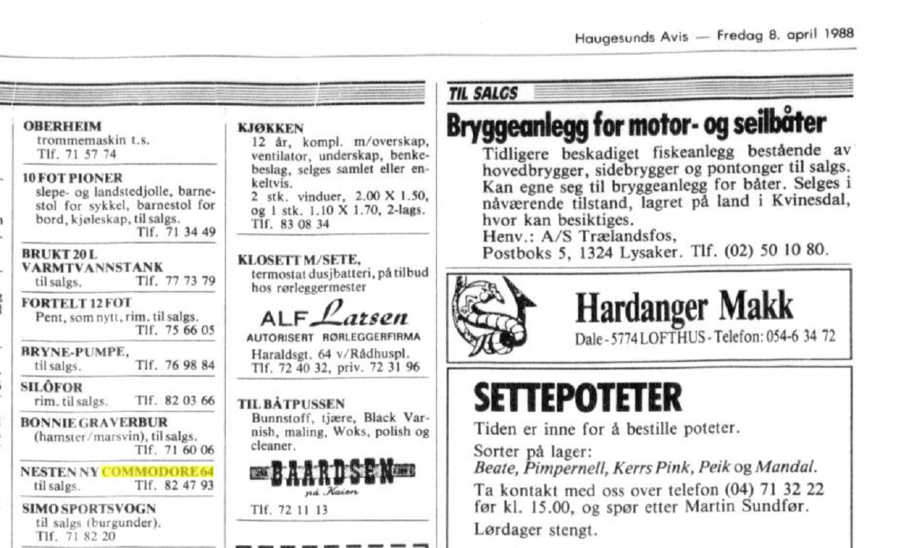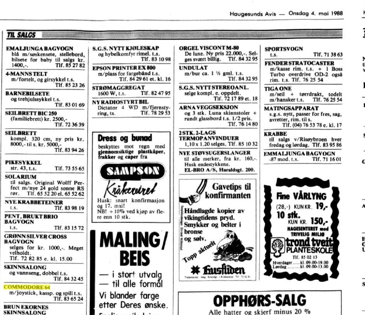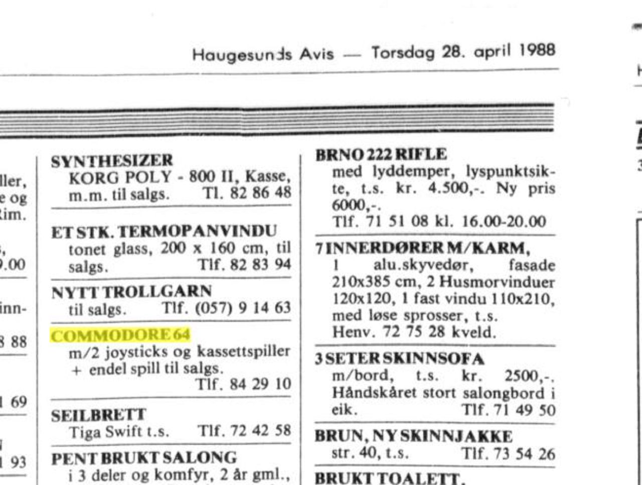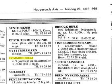 The only potentional proof I have visually, is from local newspaper ad's (Haugesund's Avis) from the March-May 1988 period, as I do remember we bought the C64 after I found an ad. Naturally I can't remember the price, but its was most like 1300,- or 1500,- NOK. The machine was advertised with 2 joysticks, some tape games and potentionally a mention of several hundred games (which was turbo-tapes, which took me 2-3 weeks to figure out of. I remember I had to call either the seller or some of my friends to get help). I did an research into the newspaper through a digital archive and snipped out the most likely ad that caused me to buy it. That in itself is just epic, as it started a life-long journey I have never regretted and it bears some much fun!