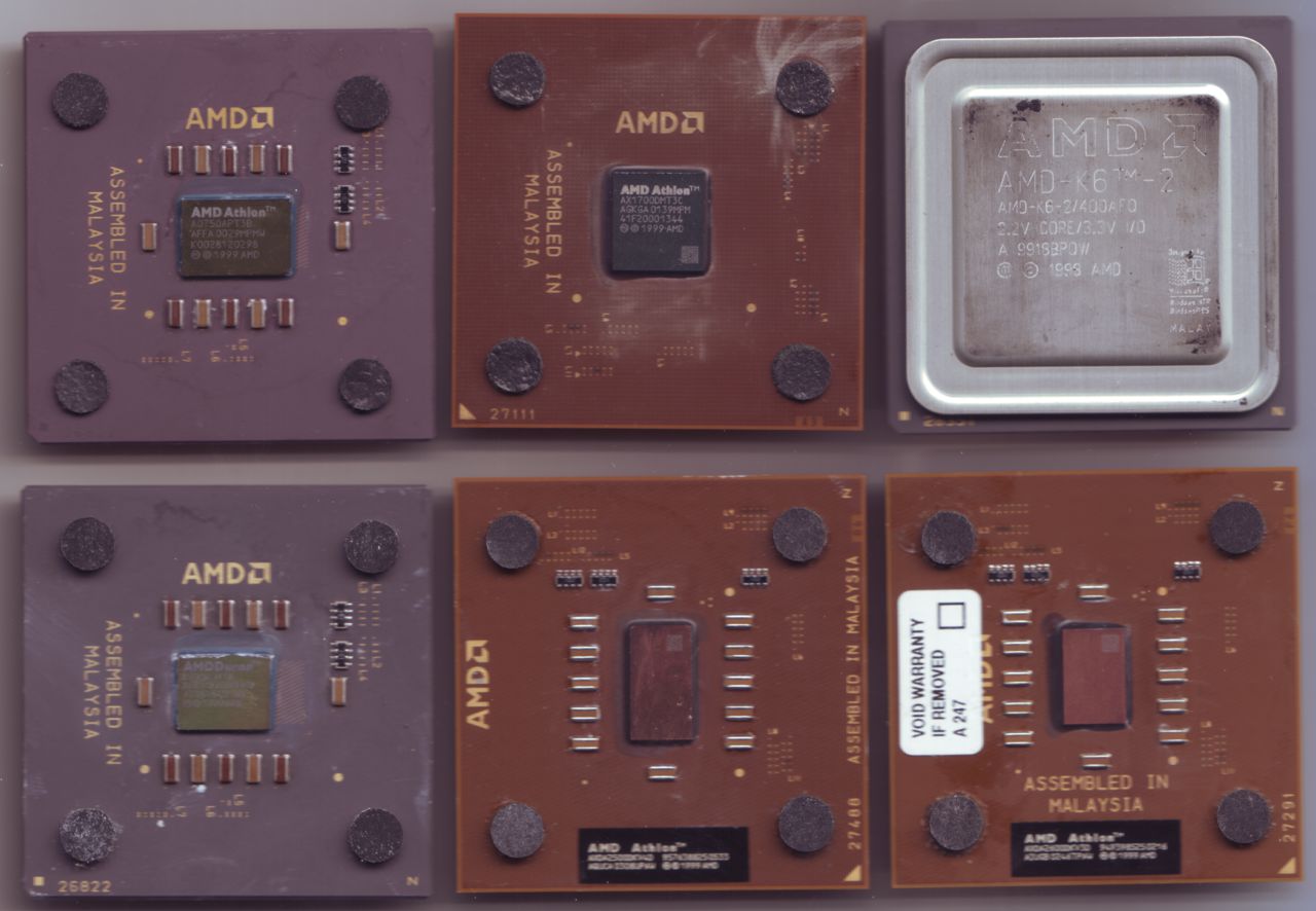 Listed from top-left: ------------------------ AMD Athlon (K7 series) - Slot A A0750APT3B AFFA0029MPMW K0028120298 1999 750MHz, 512kb L2 Cache, 100MHz FSB 1.75V - AMD Athlon (K7 series) - Slot A AX1700DMT3C AGKGA0139MPM 41F20001344 1999 1470MHz, 256kb L2 Cache, 133MHz FSB 1.75V - AMD-K6-2 w/MMX AMD-K6-2/400AFQ 2.2V CORE/3.3V 1/0 A 9918BPQW 1999 400MHz, 128kb L2 Cache, 66MHz FSB - AMD Duron - Slot A D700AUT1B AKBA0038MPMW 92381840166 1999 700MHz, 64kb L2 Cache, 100MHz FSB - AMD Athlon (K7 Thunderbird) - Slot A AXDA2500KV4D 957638825OS33 AQUCA 0308UPAW 1999 1830MHz, 256kb L2 Cache, 133MHz FSB 1.75V - AMD Athlon (K7 Thunderbird) - Slot A AXDA2600KV3D 949398S250216 AIUGB 0246TPAW 1999 1930MHz, 256kb L2 Cache, 133MHz FSB 1.75V